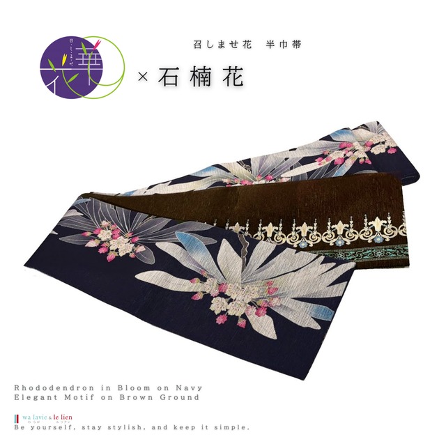 ≪召しませ花/半巾帯 ~着たくなるキモノ~≫ 召しませ花(めしませはな)は、京都の老舗「京都小泉株式会社」が手がける現代きものブランドです。 テーマは“着たくなるキモノ”。 キレイで可愛く、手に取りやすい価格と高品質を両立し、和の世界に目覚める世代を中心に支持されています。 決まりごとに縛られない自由な発想と、こだわり抜いた色使い・デザインが特徴で、カジュアルに楽しめる着物や日常使いしやすい和小物を展開。 召しませ花のコレクションの中から”わらびルリアン”が厳選した半巾帯をセレクト。 デザイン性と使いやすさを兼ね備えた一本で、日常のきものスタイルをより楽しく彩ります。 現代的な感覚で和装を楽しみたい大人の女性におススメです。 ■ 柄【石楠花(しゃくなげ)】 A面:深みのある紺地に、大輪の石楠花を大胆に配した意匠です。白を基調とした花弁に、淡い水色のぼかしを重ねることで、花の立体感と清涼感を表現しております。中心にはやわらかな桃色を添え、可憐さと上品さを引き立てています。 大きく広がる花姿は、華やかでありながらも落ち着きがあり、凛とした佇まいを感じさせます。濃地との対比により、石楠花の存在感がより一層際立つデザインです。 B面:裏面は深い茶色を基調とし、繊細な装飾文様を横段にあしらっています。連続する優美な曲線模様に、さりげなく配された淡い青や生成り色がアクセントとなり、落ち着きの中にも気品を感じさせる仕上がりです。 表の華やかさとは対照的に、裏は格調高くシックな印象で、結び方によって異なる表情をお楽しみいただけます。 ■ 素材 表地:絹 75%/ポリエステル 25% 芯地:ナイロン 60%/ポリエステル 40% ■ サイズ 幅:約16.5cm 長さ:約425cm お仕立て上がり(届いてすぐにご使用いただけます) ■ 特徴 ・リバーシブル仕様で2wayデザイン ・しわになりにくく結びやすい絹混生地 【備考】 帯単品での価格になります。着物・小物などは別売りです。 商品在庫は店頭との共有となります。ご注文のタイミングによっては、在庫切れの場合もございます。予めご了承ください。 ご心配な場合は、お買い上げ前にお問合わせをお願いいたします。 掲載画像は、実際の色味に近づける努力をしておりますが、お使いの画面やブラウザによって写真と実物の色味が違って見える場合もございます。ご了承ください。 こちらもお問合せいただければ、別アングルの画像を送付など対応させていただきますので、よろしくお願いいたします。