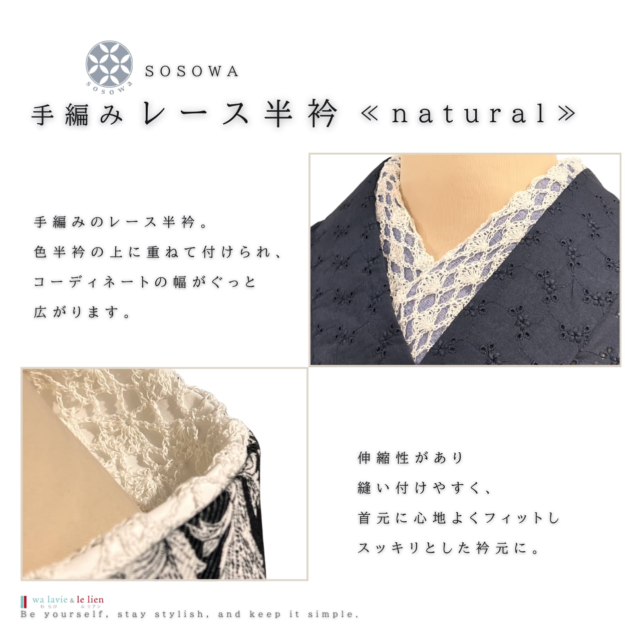 伸縮性があるため、縫い付けがしやすく、衿元にやさしくフィットします。