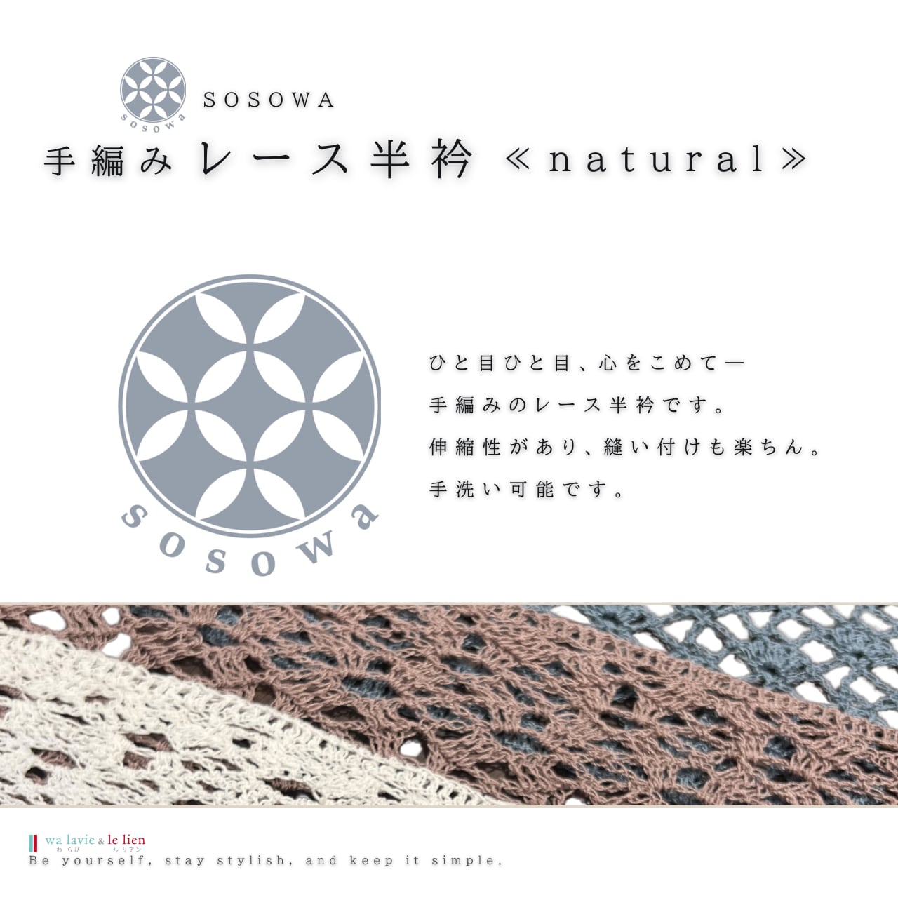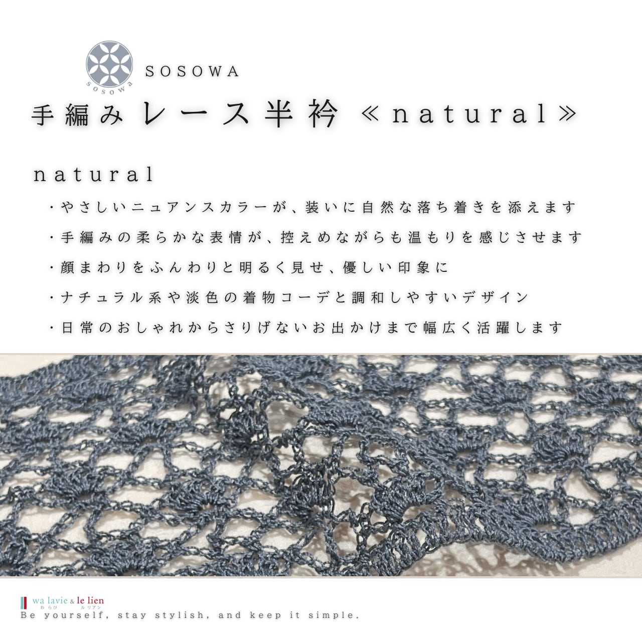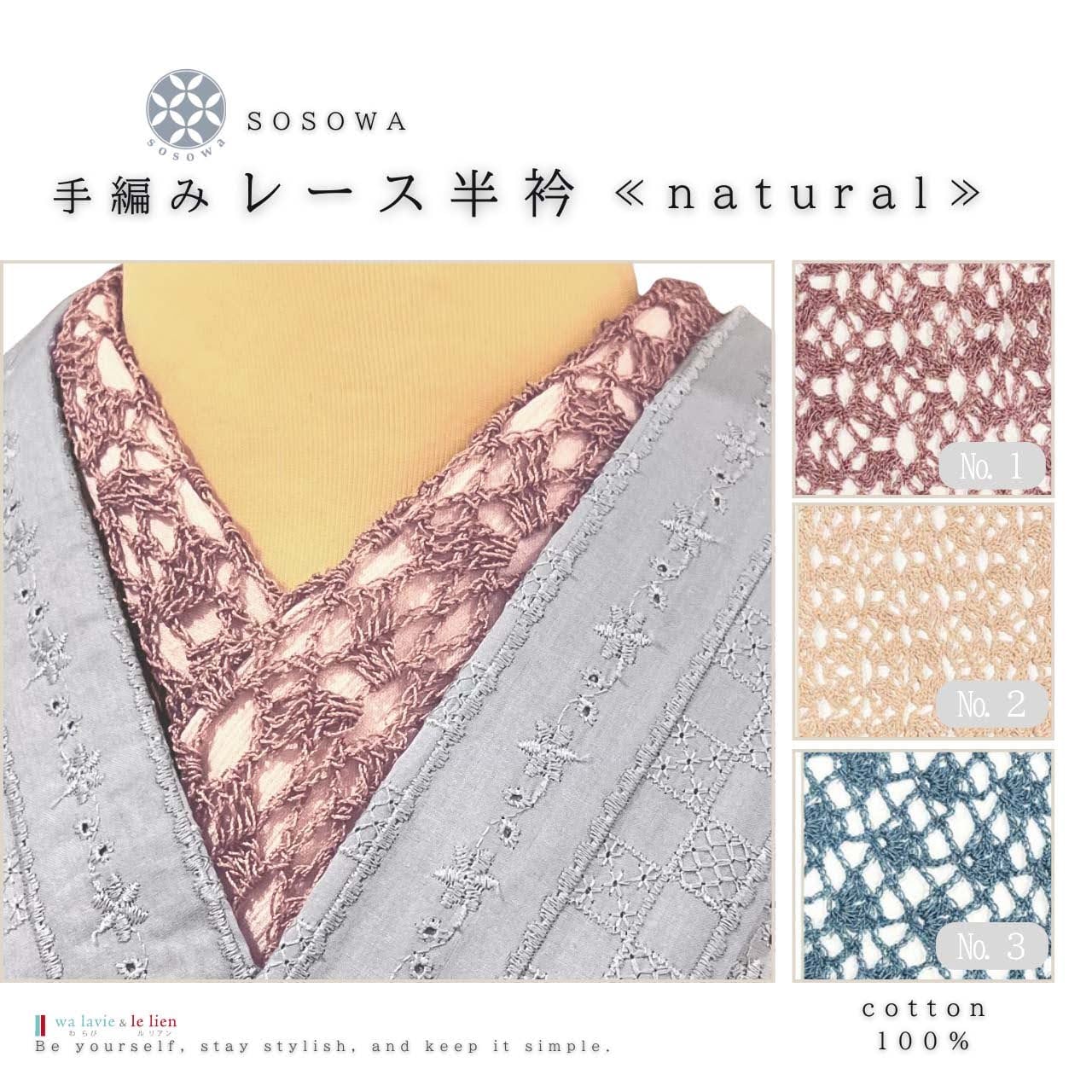 やさしい風合いが魅力の、手編みのレース半衿です。