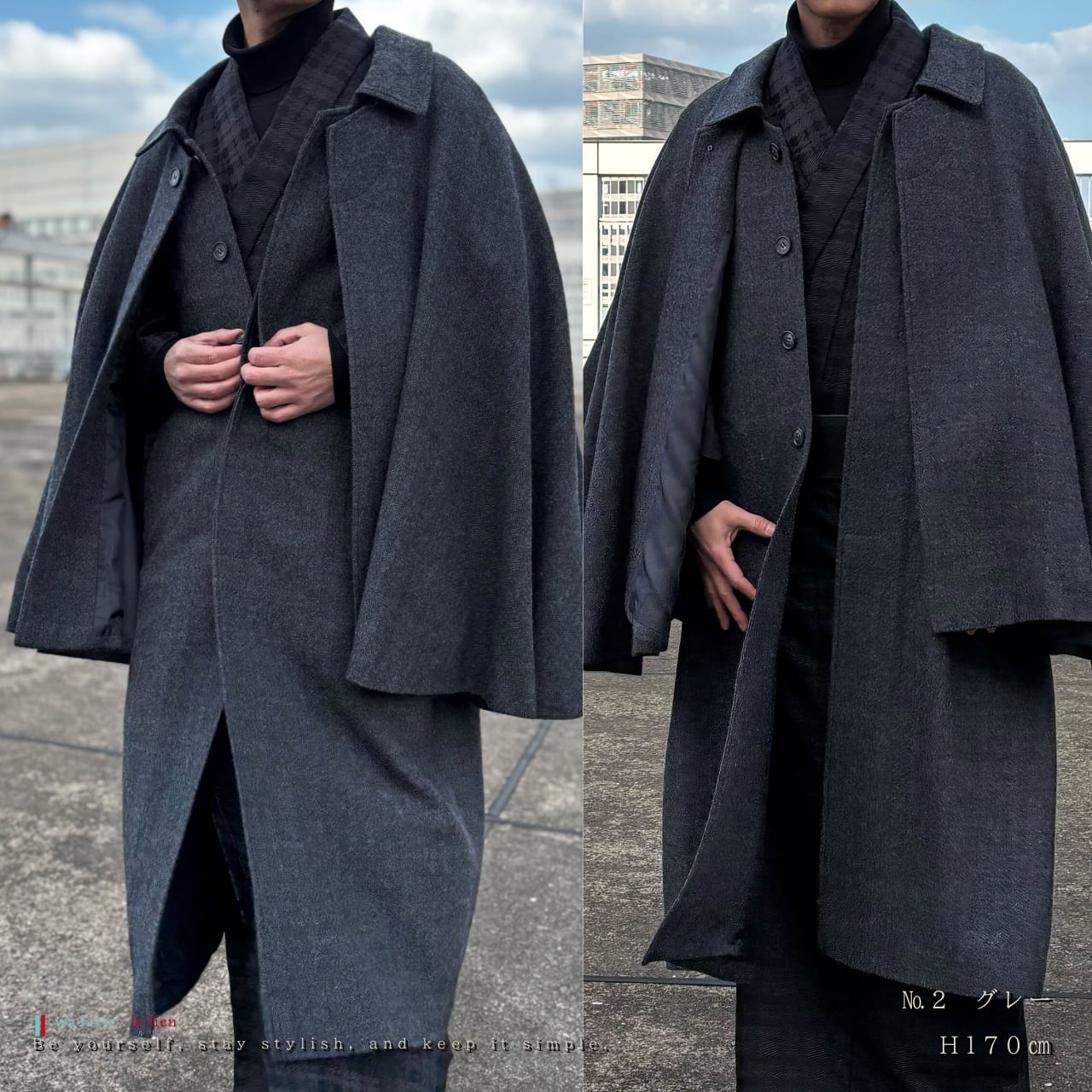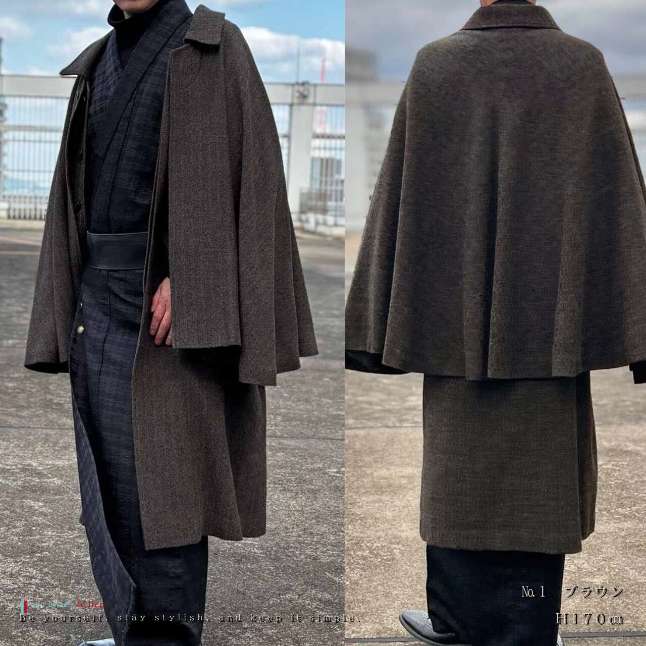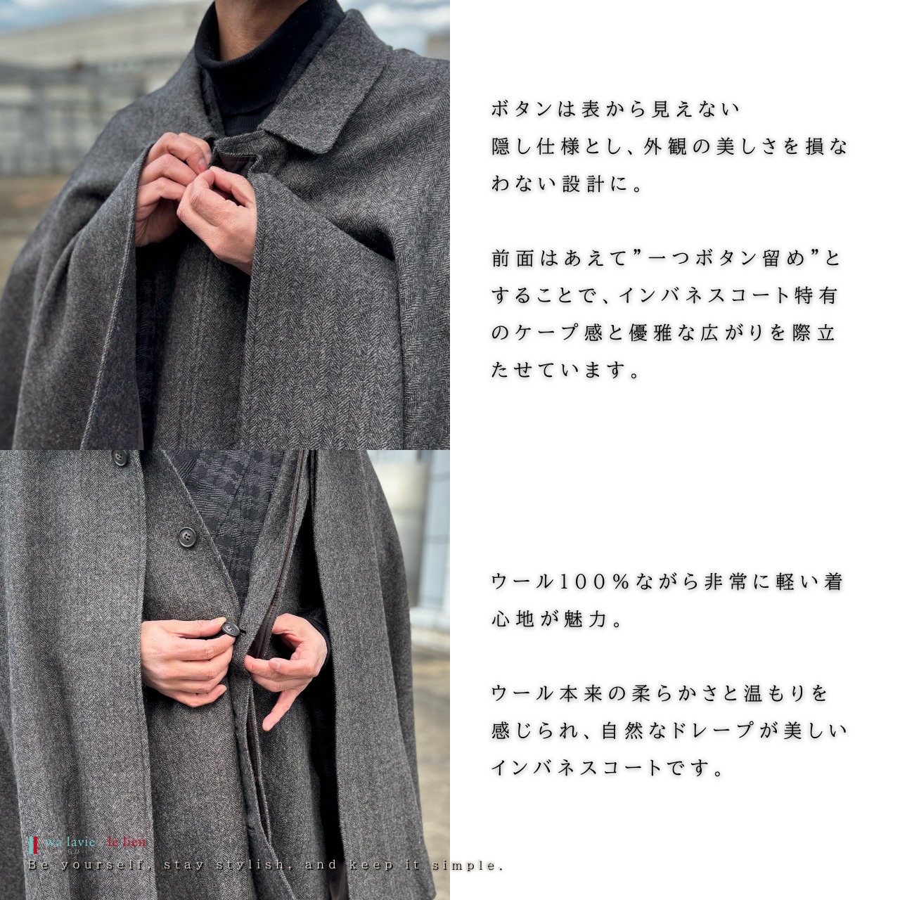 前面はあえて”一つボタン留め”とすることで、インバネスコート特有のケープ感と優雅な広がりを際立たせています。