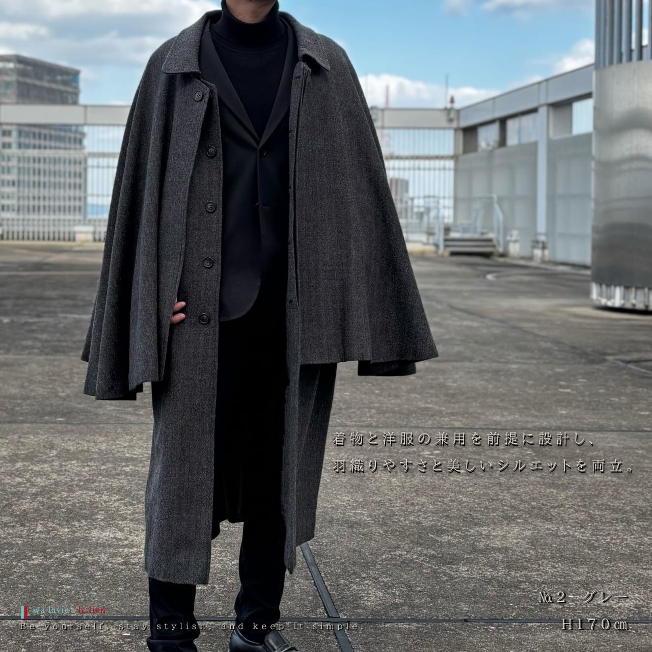 着物の上から羽織っても着崩れしにくく、洋服の上ではコートとして美しいラインを保つよう、全体の分量と丈感を細かく調整しています。