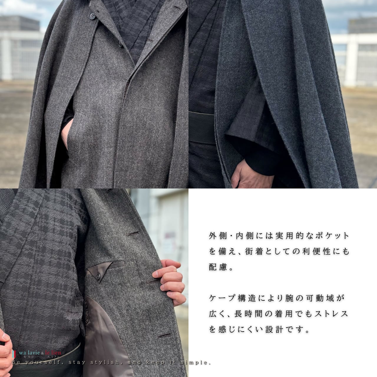 クラシックな佇まいを保ちながら、現代の街着として自然に溶け込む一着に仕上げています。