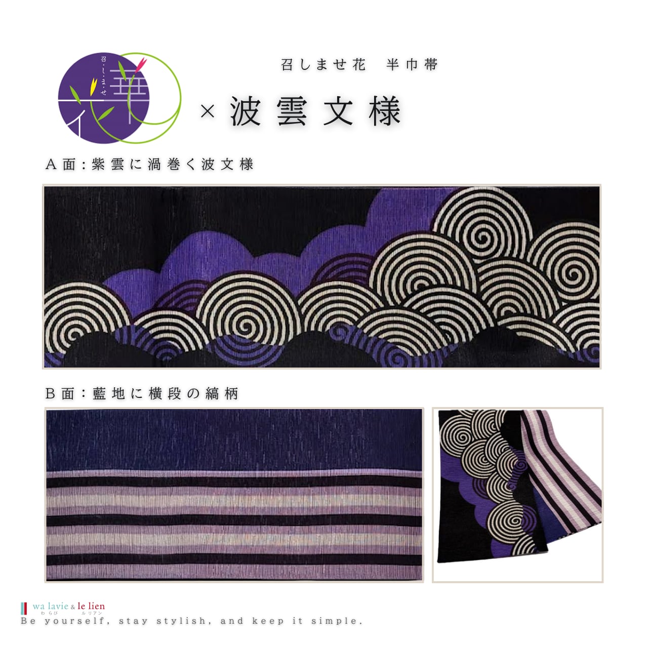B面:深みのある藍地に、白と紫の横段を配したすっきりとしたデザイン。直線的な構成が落ち着きと端正さを感じさせ、表の華やかさを引き立てる上品な仕上がりです。
