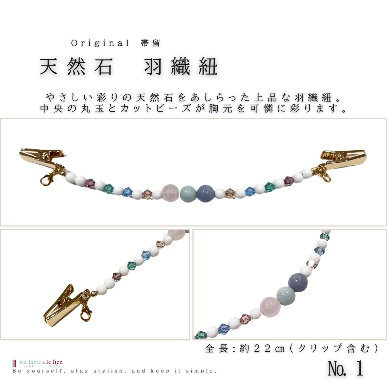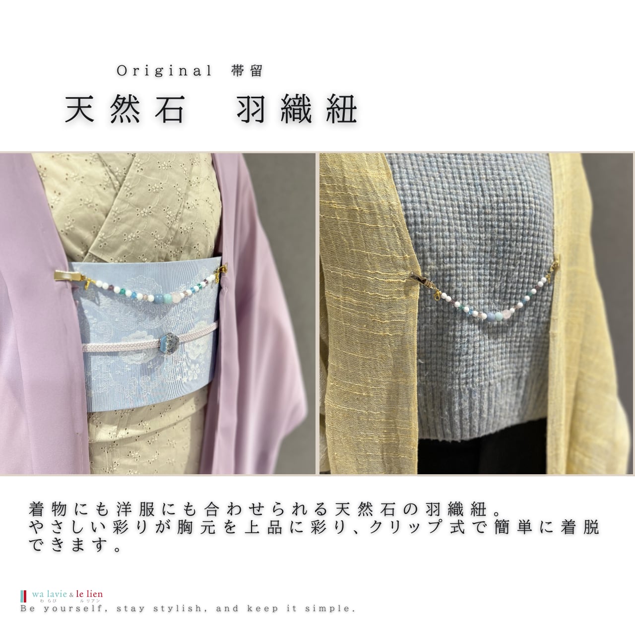 やさしい彩りの天然石をあしらった上品な羽織紐。中央の丸玉とカットビーズが胸元を可憐に彩ります。