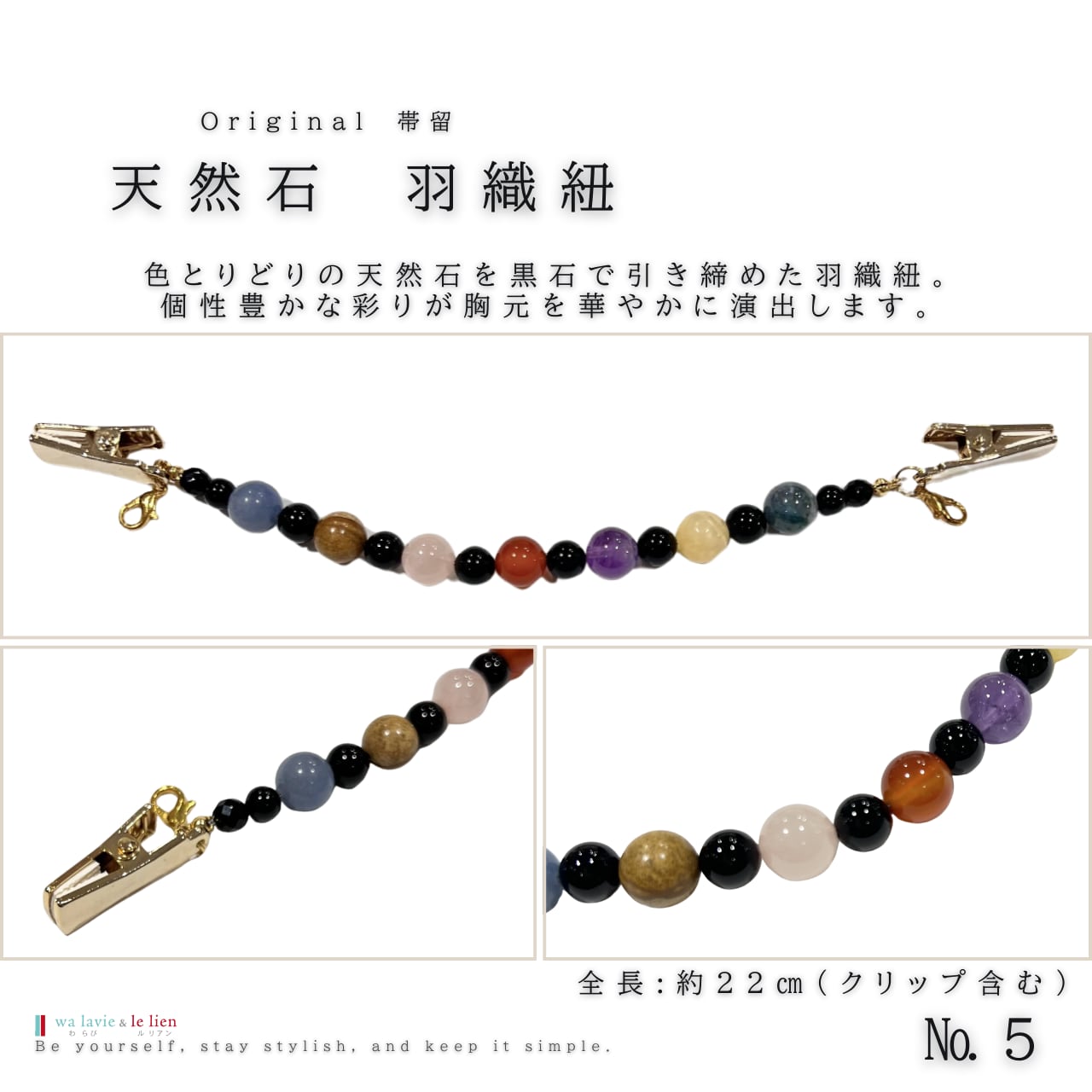 中央に存在感のある天然石を配したもの、色とりどりの石を組み合わせた華やかなタイプ、落ち着いた黒や深みのある色合いで胸元を引き締めるタイプなど、幅広いバリエーションをご用意。お着物の雰囲気や季節、装いのシーンに合わせてお選びいただけます。