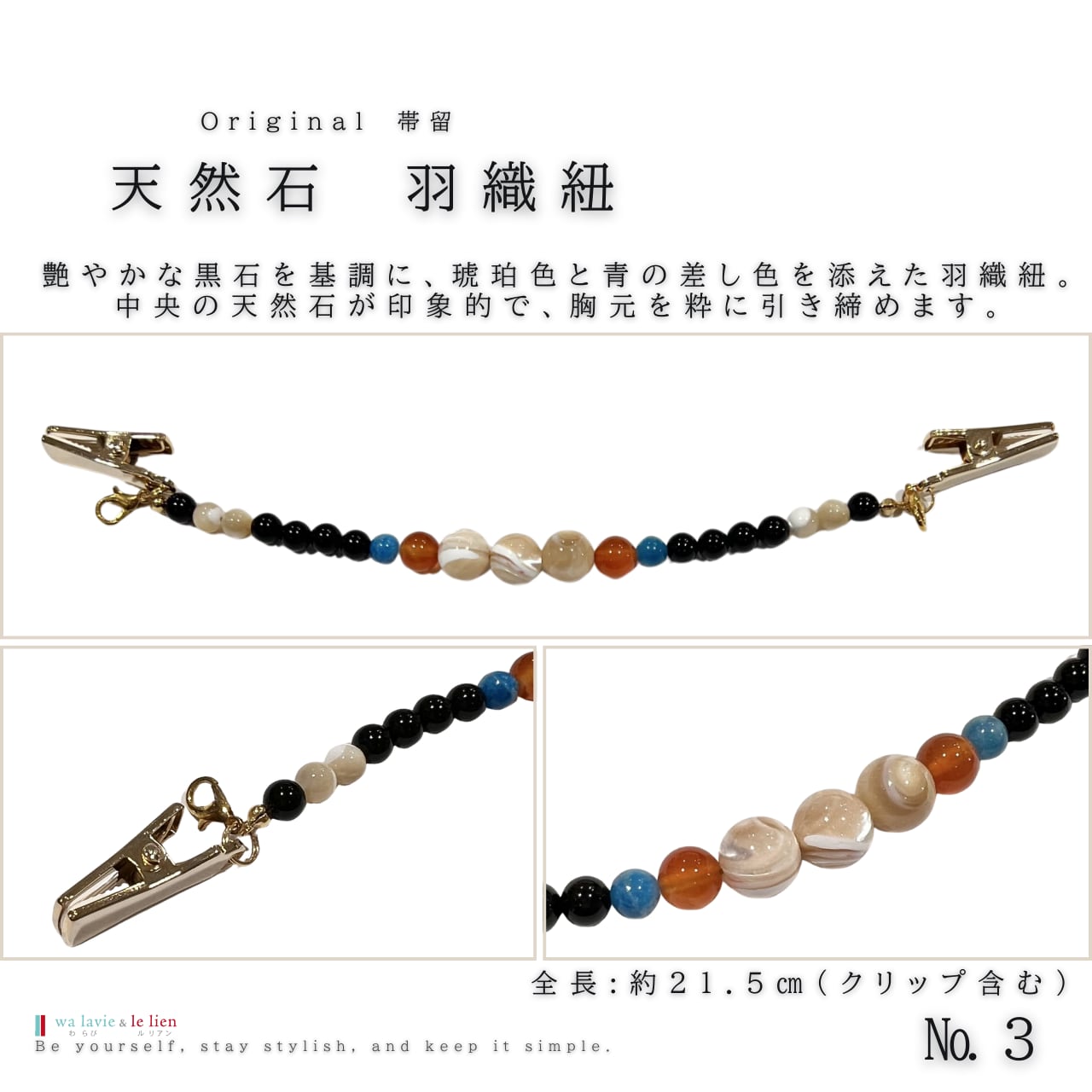 艶やかな黒石を基調に、琥珀色と青の差し色を添えた羽織紐。中央の天然石が印象的で、胸元を粋に引き締めます。