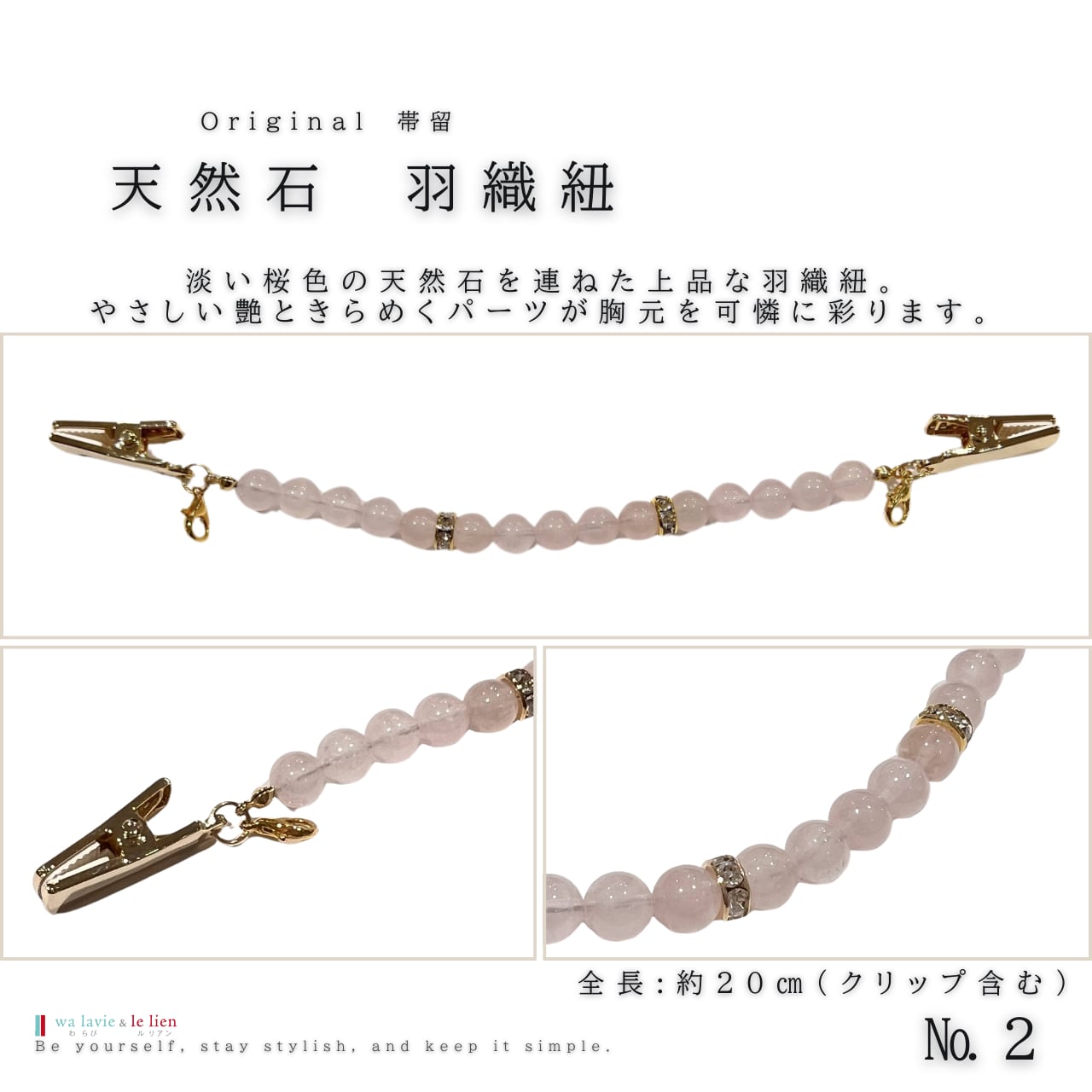 淡い桜色の天然石を連ねた上品な羽織紐。やさしい艶ときらめくパーツが胸元を可憐に彩ります。