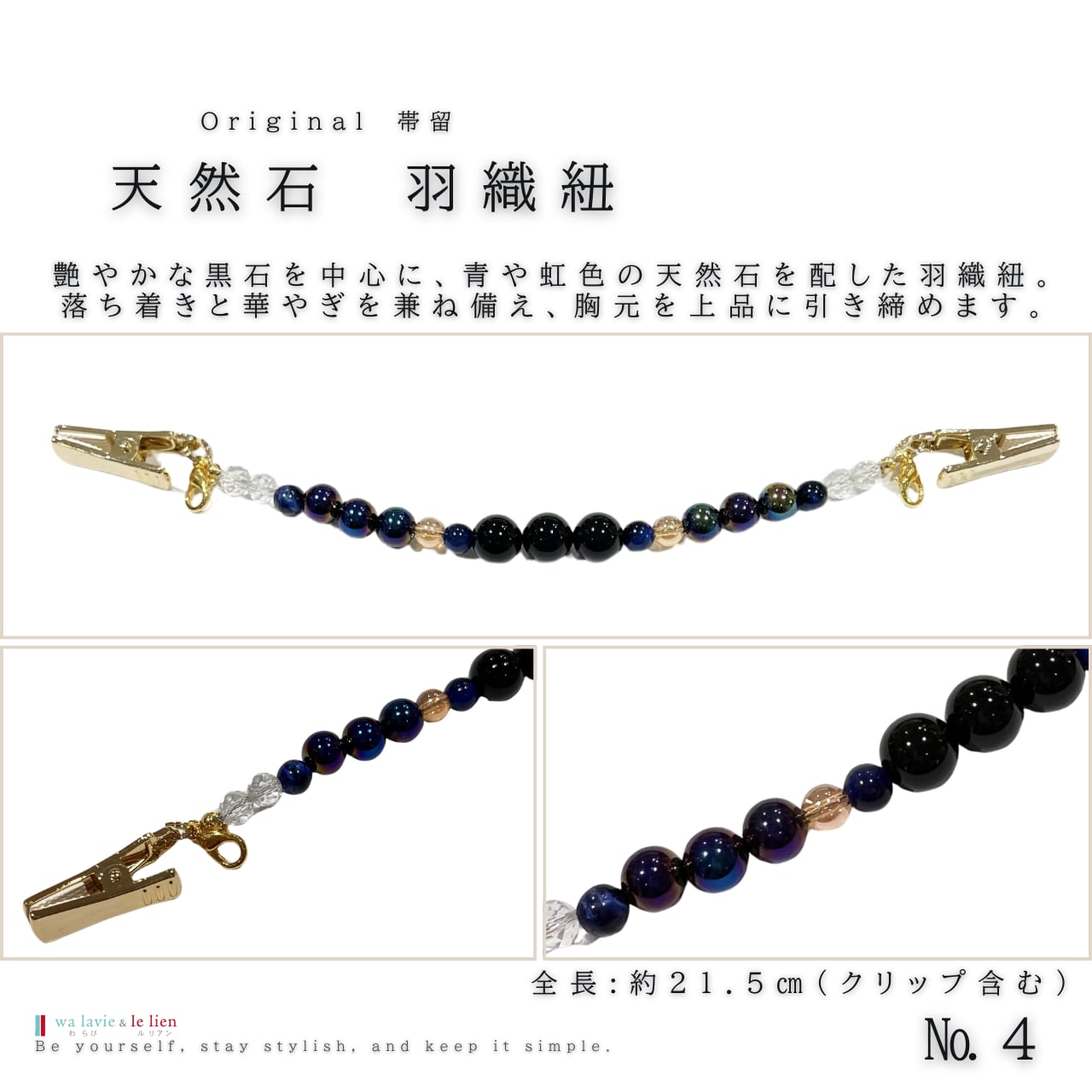 艶やかな黒石を中心に、青や虹色の天然石を配した羽織紐。落ち着きと華やぎを兼ね備え、胸元を上品に引き締めます。