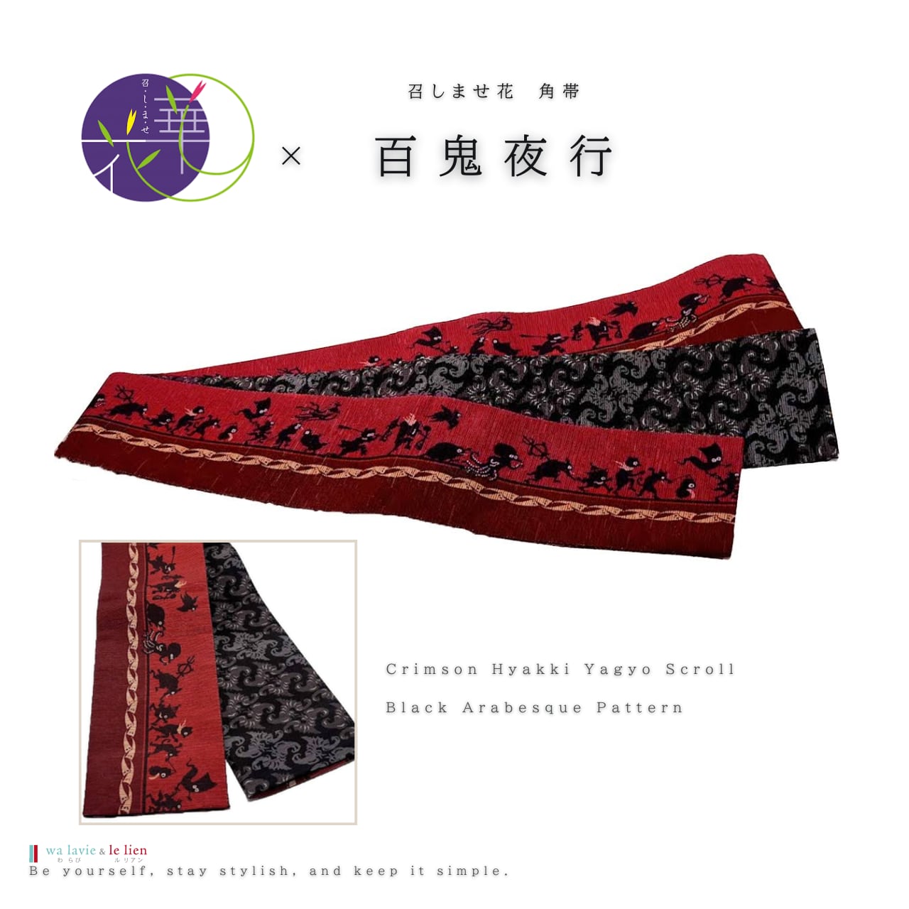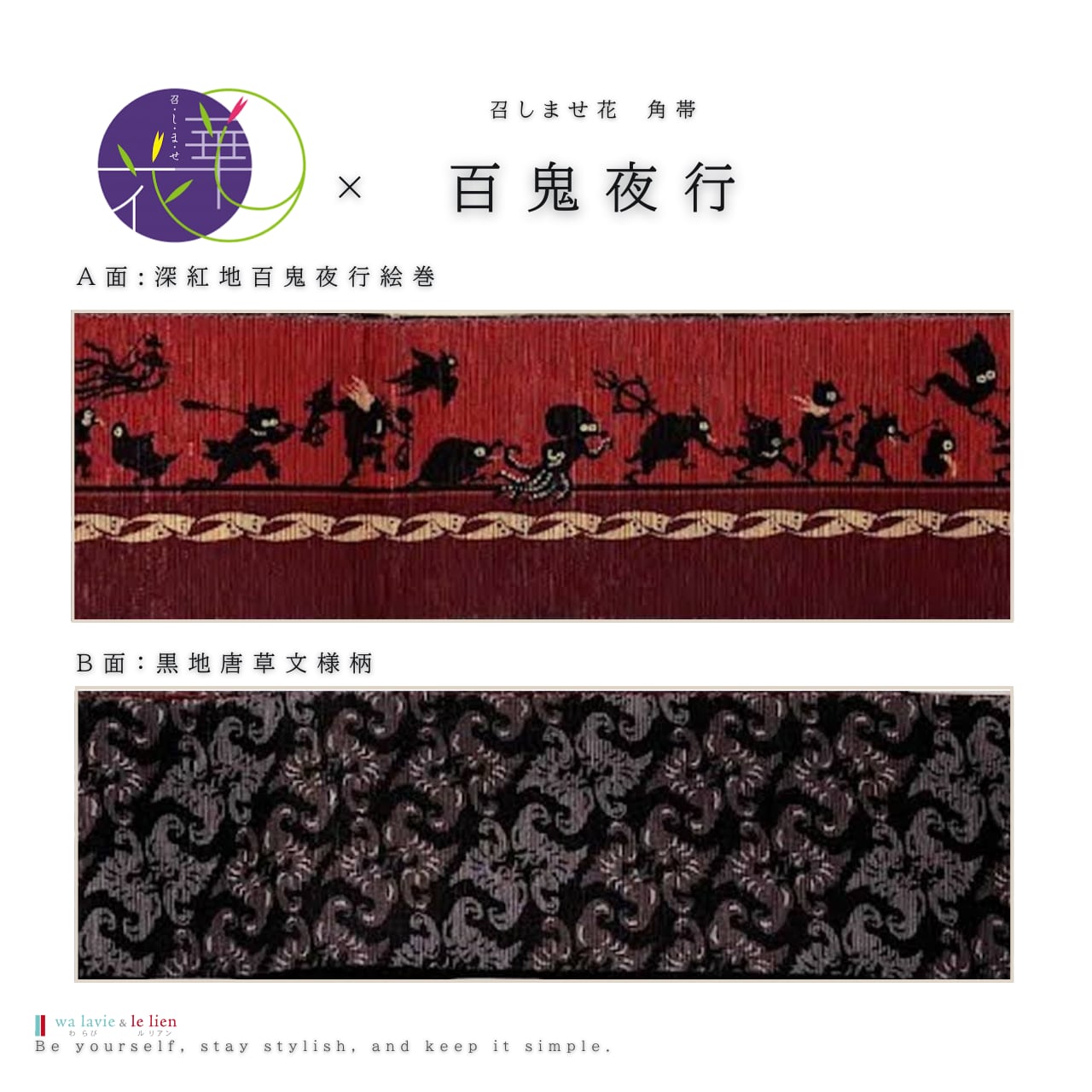 A面:深紅の地に、さまざまな妖怪たちが列をなして歩く百鬼夜行の意匠。躍動感ある黒のシルエットが映え、遊び心と物語性を感じさせる粋なデザインです。