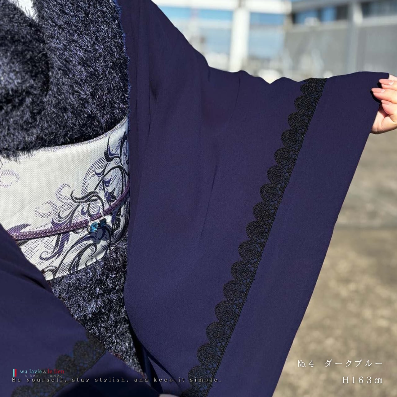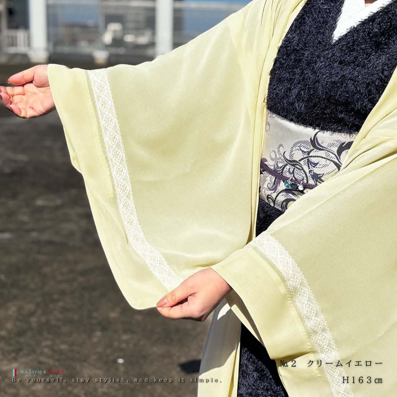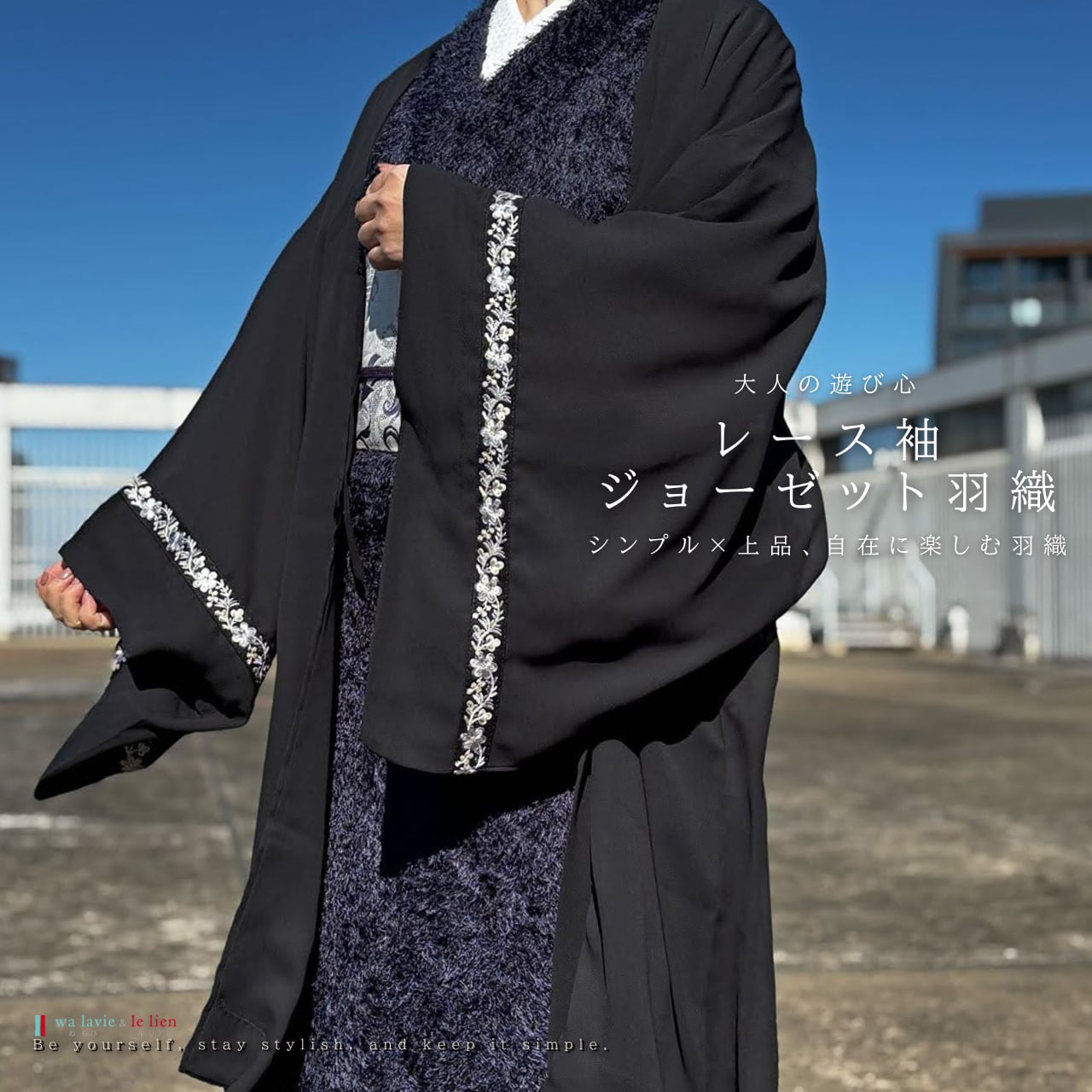 シンプルな装いに、さりげなく個性を添えるジョーゼット羽織。軽やかで程よい透け感のある生地がやわらかく揺れ、袖口にあしらった繊細なレースが控えめな華やぎを演出します。