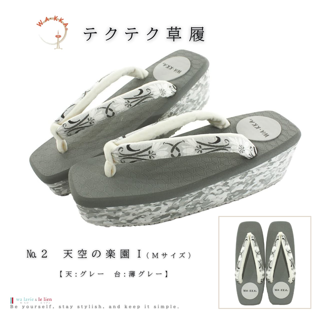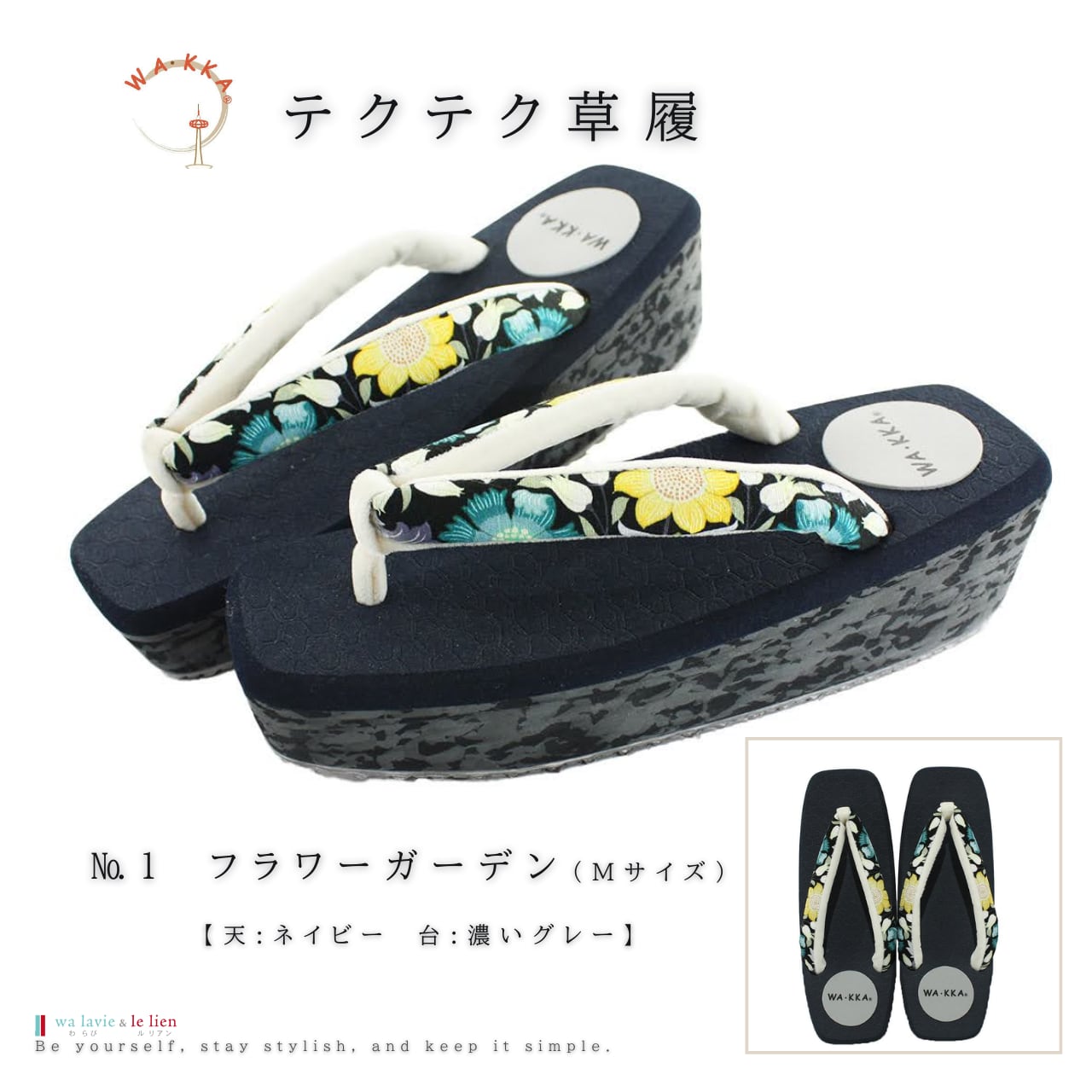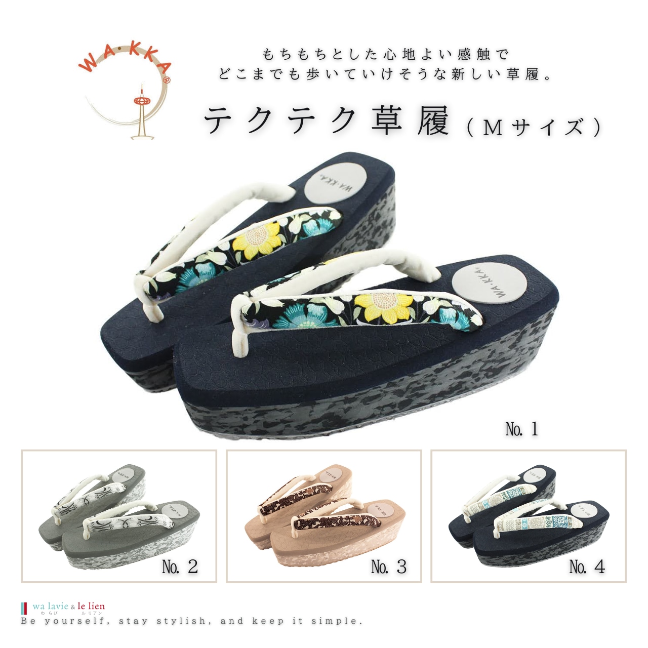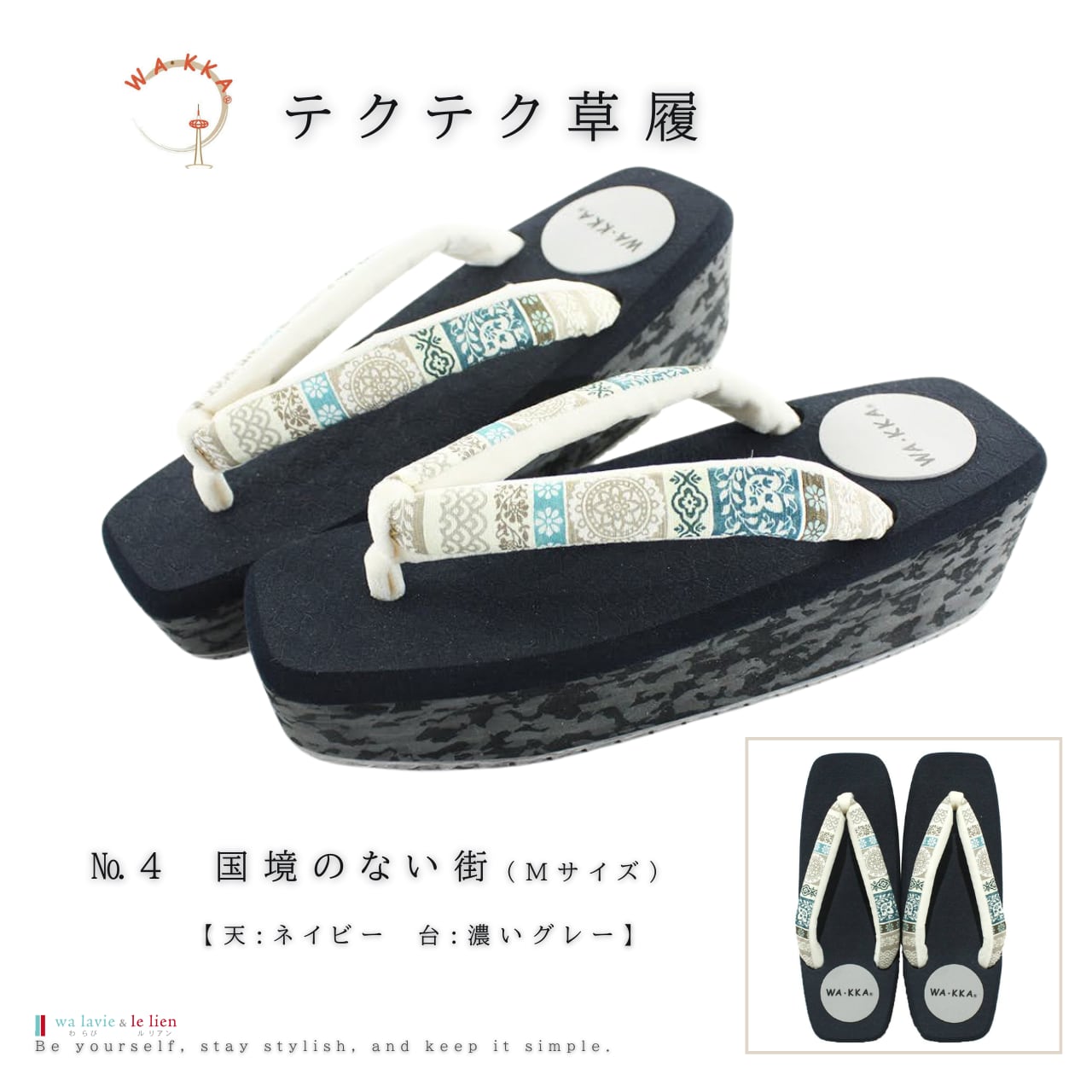 京都のきものメーカーWA・KKA(わっか)。「きものでのお出かけをもっと楽しく」をコンセプトに、オリジナルの鼻緒生地を使用して仕立てた「テクテク草履」です。