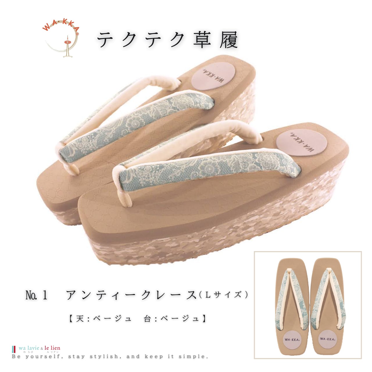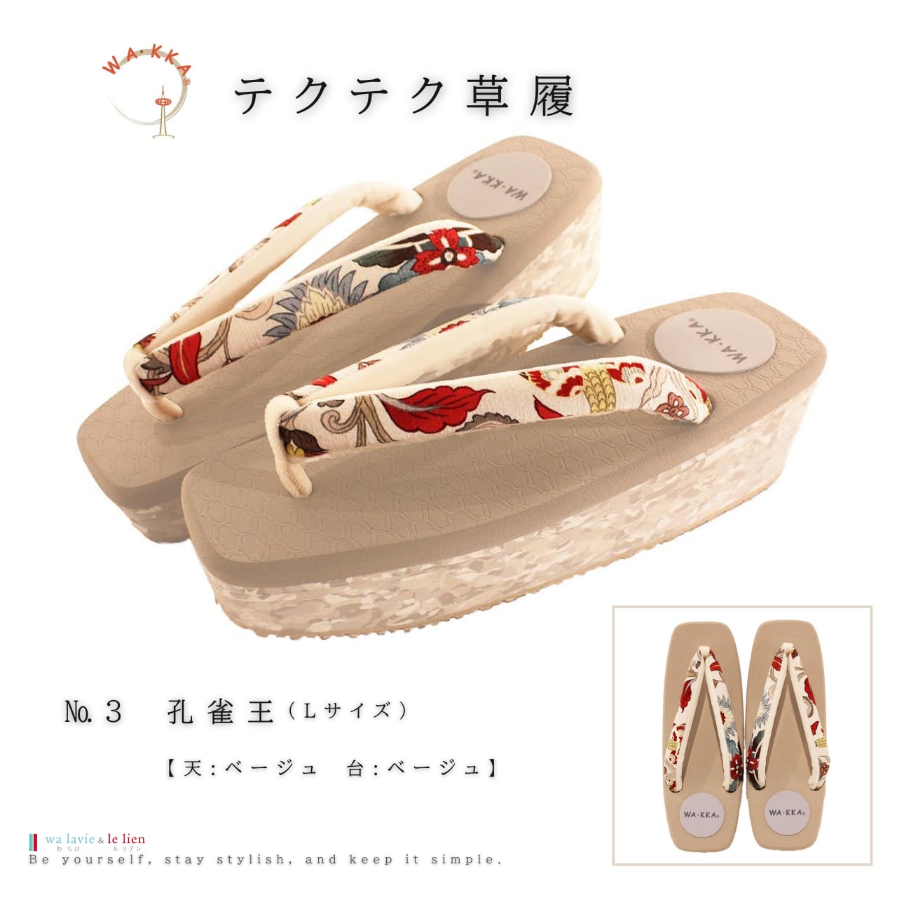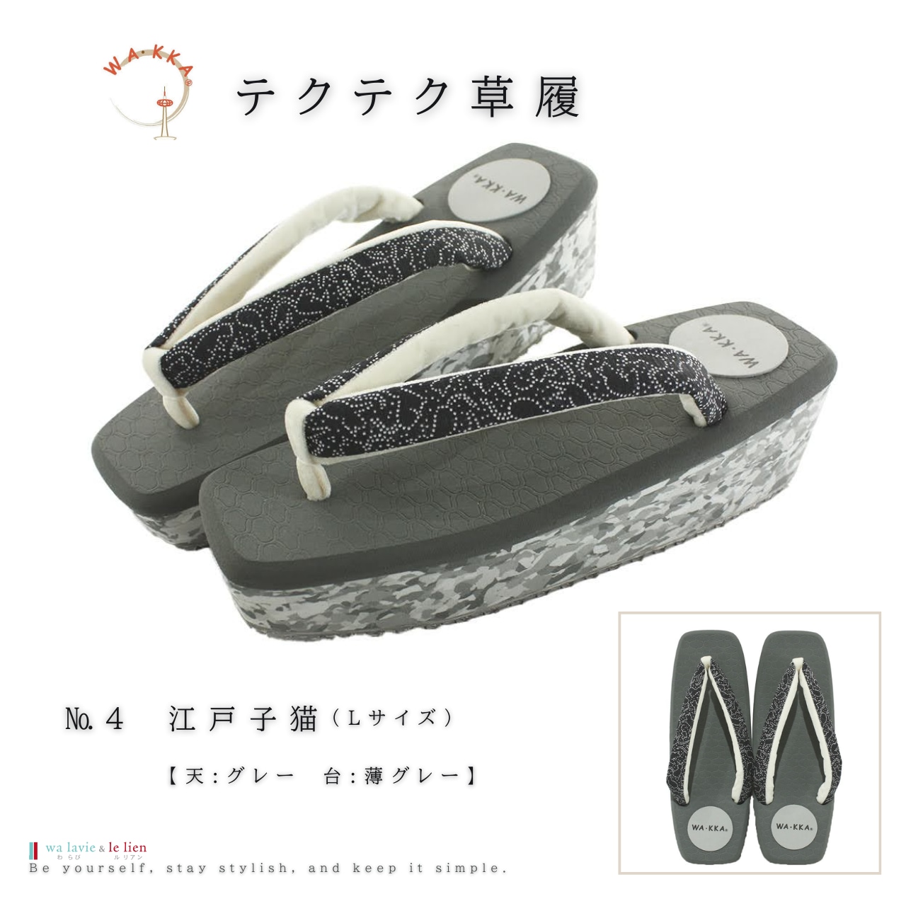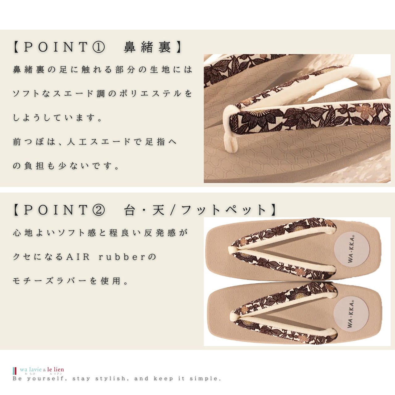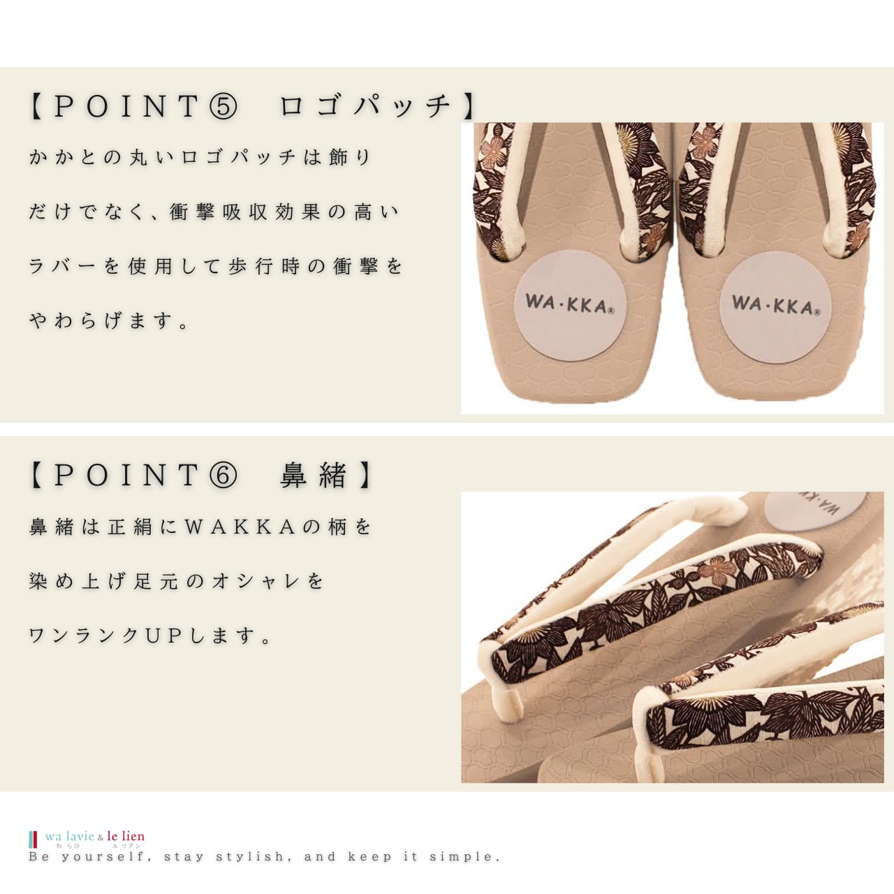 鼻緒は正絹にWAKKAの柄を染め上げ足元のオシャレをワンランクUPします。