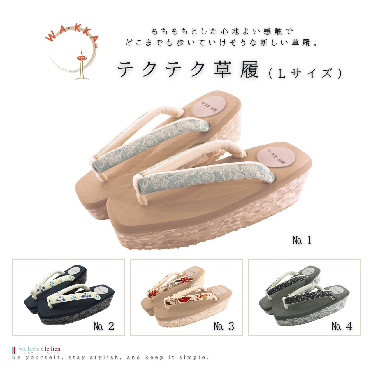 京都のきものメーカーWA・KKA(わっか)。「きものでのお出かけをもっと楽しく」をコンセプトに、オリジナルの鼻緒生地を使用して仕立てた「テクテク草履」です。
