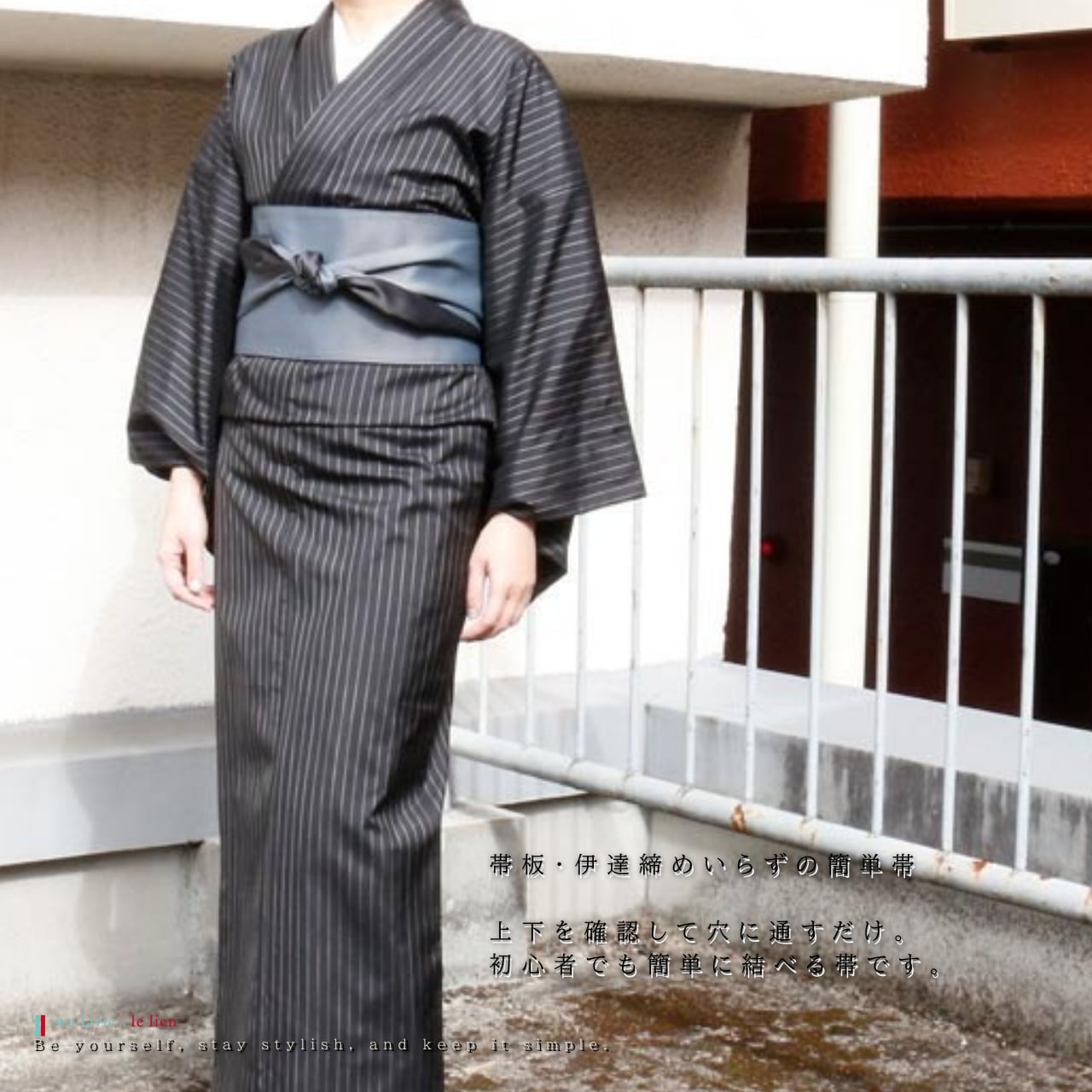 着物のためにキュッと締めて苦しくない帯用の設計がされていますので、着用時は上下の向きを確認し、あとは洋服のサッシュベルトを締める要領で簡単に締めることが可能です。